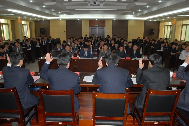 下午14点30分,各代表团团长向主席团汇报了讨论情况,矿总经济师俞善松作了《第一届二次“双代会”职工提案落实情况及本次“双代会”提案解答报告》。