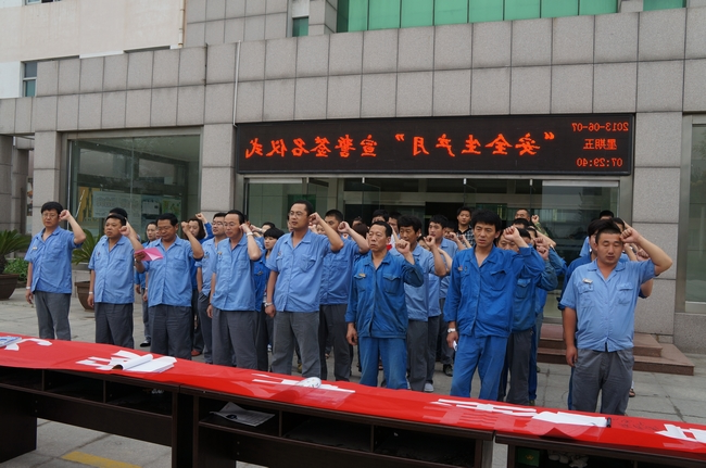 厂级领导、机关部室全体人员、机修车间人员在刘总的带领下宣誓,参加宣誓人员举起右手,紧握拳头进行庄严宣誓。随后在条幅上郑重写下自己的名字,确保安全生产。